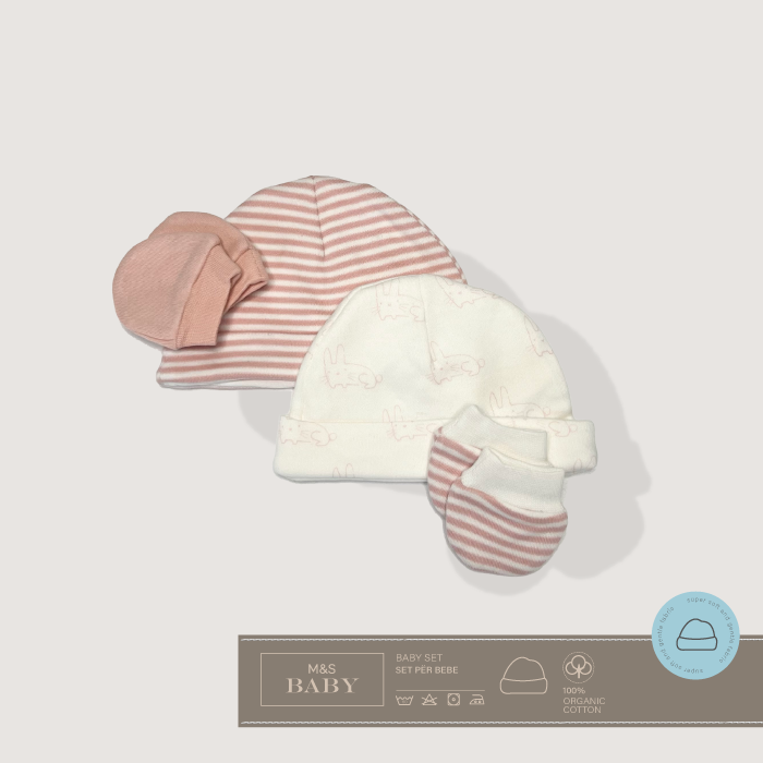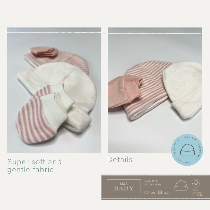 Set me 2 kapuça dhe 2 palë dorashka për bebet që lindin herët – premature. Shumë të lehta për tu veshur me pambuk organik të butë.